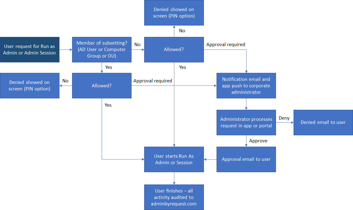 W przypadku instalacji oprogramowania lub uruchomienia aplikacji z uprawnieniami administratora, użytkownik korzysta z funkcji Admin By Request „Uruchom jako administrator”. Wówczas ma miejsce jeden z czterech scenariuszy, w zależności od wcześniej skonfigurowanych w panelu ABR ustawień:
